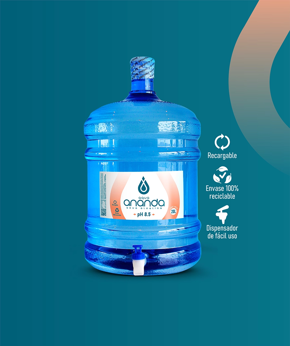 Bidón de 20 litros con cañito dispensador de fácil uso para disfrutar el mejor sabor de agua alcalina, además es reutilizable y reciclable. Cuida tu bienestar mientras proteges al planeta.
